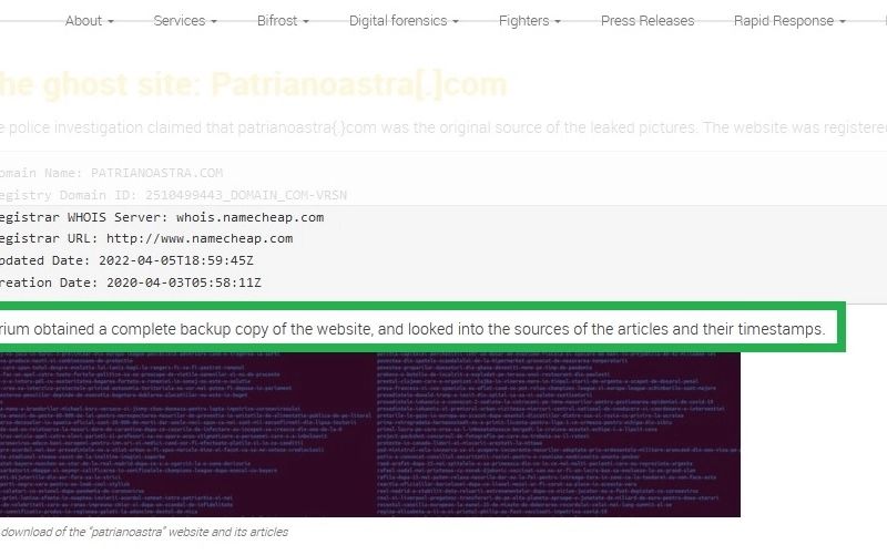“Fotografiile personale ale jurnalistei române de investigație Emilia Șercan au fost publicate de site-ul moldovenesc realitateadinmoldova{.}md pe 17 februarie 2022, dar când jurnalista a încercat să investigheze cine se afla în spatele scurgerii, Poliția Română a indicat site-ul „fantomă” patrianoastra[.]com ca sursă originală. La patru zile după ce pozele au fost publicate pe site-ul din Moldova, Poliția Română a prezentat un document de 29 de pagini în care era descrisă cronologia evenimentelor și a indicat site-ul patrianoastra[.]com drept site-ul care a publicat pentru prima dată captura de ecran și imaginile și a stabilit ca dată de publicare ziua de 17 februarie 2022, ora 5:45.”