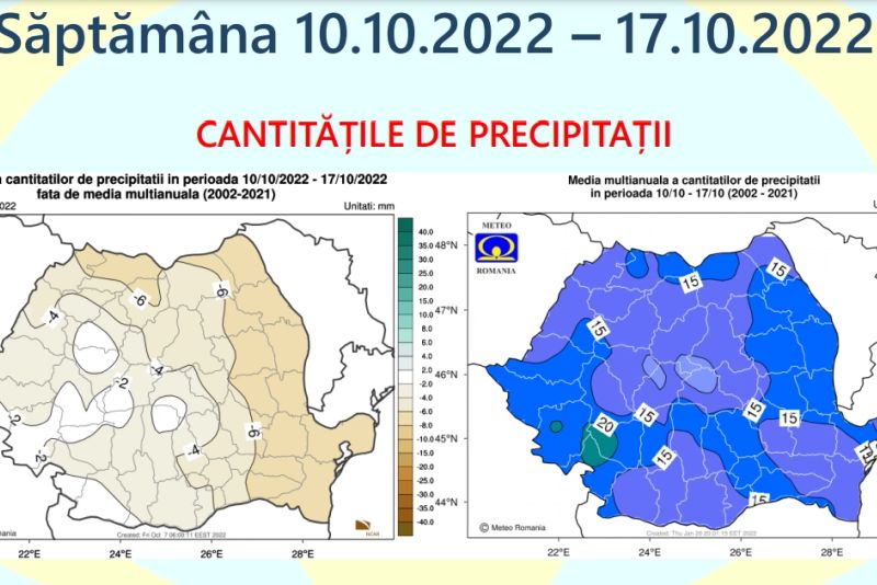 Mediile valorilor termice se vor situa ușor peste cele specifice pentru această săptămână, în cea mai mare parte a țării. Cantitățile de precipitații vor fi în general apropiate de cele normale pentru această perioadă, dar cu posibilitatea unui ușor excedent în sud-vest.