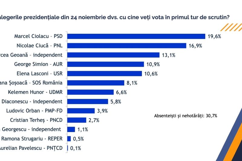 Întrebați cu cine vor vota, 19,6% dintre românii chestionați l-au indicat pe Marcel Ciolacu (PSD), 16,9% pe Nicolae Ciucă (PNL), iar 13,1% pe Mircea Geoană (candidat independent).