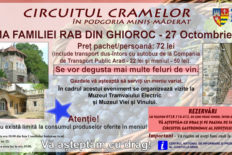 Programul include degustare de vinuri la Crama Familiei Rab, din Ghioroc, vizită la Muzeul Tramvaiului Electric și la Muzeul Viei și Vinului. Pe lângă degustarea de vin propriu-zisă, turiștii au incluse în meniu un prânz și alte băuturi din struguri. Prețul pachetului este de 72 lei/persoană și include transportul dus-întors cu autobuz, meniul, degustările și vizita la muzeu.Plecarea va avea loc la ora 10.00 din fața Consiliului Județean Arad, iar întoarcerea la Arad este programată la ora 15.00.Rezervările se pot face la numărul de telefon 0728.116.412, de luni până vineri, între orele 9.30 – 16.30.„Cramele și vinurile produse în această regiune reprezintă un brand al Aradului. Avem șansa să avem la noi în județ o zonă viticolă de care putem fi mândri, cu un potențial pe care ne dorim să îl valorificăm. Strategia CJA este ca în anii următori tot mai mulți turiști să cunoască Podgoria Aradului, iar aceștia să devină la rândul lor ambasadori ai acestei zone”, a declarat Iustin Cionca, președintele Consiliului Județean Arad.