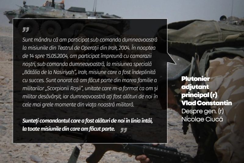 „Am onoarea să vă salut Domnule General! Sunt caporal în rezervă Roibu Dragoș Titel, și sunt mândru că am participat sub comanda dumneavoastră la misiuni în teatrele de operații din Afganistan în 2002 și 2004 Irak. In noaptea de 14.05.2004 împreună cu camarazii noștri Plt. maj. Dumitru, Sg. maj. Bucur Laurențiu, cap. Dinulescu Viorel (Dumnezeu să-l odihnească), Cap. Oprita Mihai și Mr. Cocioava Florinel, în misiunea specială care s-a transformat în "lupta din Nasiria", misiune care a fost condusă și comandată direct de dumneavoastră am îndeplinit-o cu succes cu toate că am fost atacați cu lovituri de AG 7 și focuri de armă automată în diverse poziții și locuri de pe parcursul acelei misiuni. Nouă celor care am fost alături de dumneavoastră ne-ați insuflat un spirit de luptători. Și acum ca și atunci suntem alături de dumneavoastră la noua provocare și împreună vom ieșim victorioși! Mult succes! Doamne ajută!”, scrie unul dintre vechii camarazi de arme ai generalului în rezervă Nicolae Ciucă, actual președinte al PNL și candidat la funcția de președinte al României.